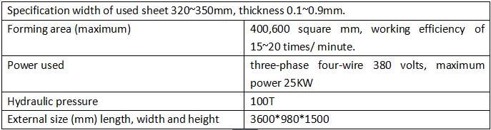 Nursery Tepsisi toxumu maşın texniki parametr İstifadə olunan vərəqin spesifikasiyası genişliyi: 300 ~ 320mm, qalınlığı: 0.8 ~ 2mm. Formation sahəsi (maksimum): 400 * 600 mm, 15 ~ 20 dəfə / dəqiqəlik iş səmərəliliyi. İstifadə olunan güc: üç fazalı dörd tel 380 volt, maksimum güc 25 kVt Hidravlik təzyiq: 100t Xarici ölçü (mm) uzunluğu, eni və hündürlüyü) 3600mm * 980mm * 1500mm