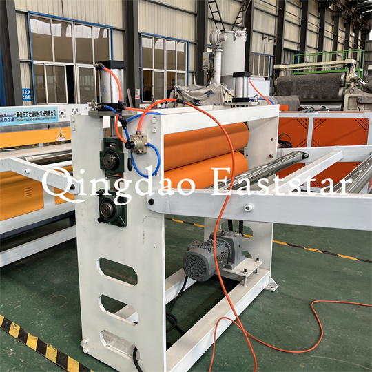 PVC əleyhinə sürüşmə mat avadanlıqları yumşaq təbəqə maşını: avadanlıq əsasən bir vidalətli ekstruder, üç rulonlu bir kalender, 6 metrlik bir soyutma
